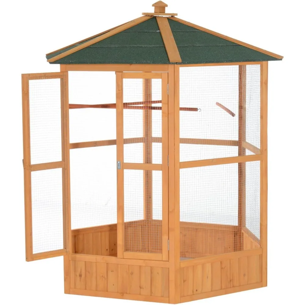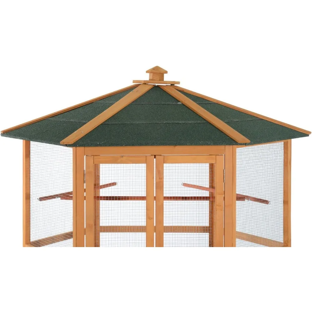 69″ Large Wooden Hexagonal Outdoor Aviary Flight Bird Cage with Covered Roof, Brown